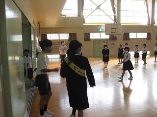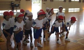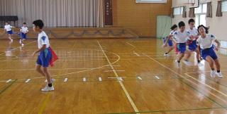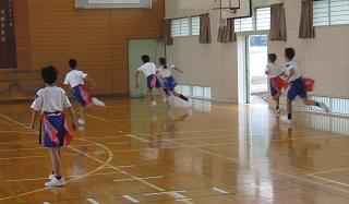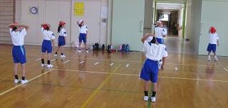 1年生の体育の授業です。準備体操の後は3分間走ります。今日は音楽に合わせて自由に歩き、音楽がとまったら先生が言った動物や昆虫などになりきっていました。