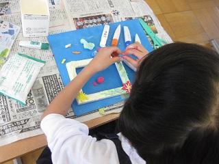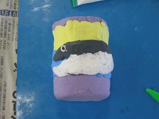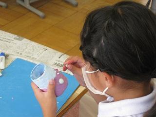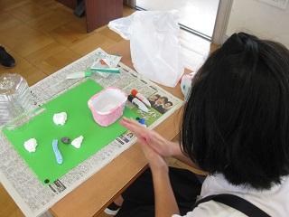 3年生の図工の授業です。白い粘土に絵の具を混ぜて色を作っています。小物入れや鉛筆立て、写真立てなどを作っていました。