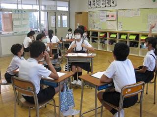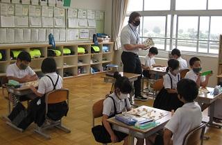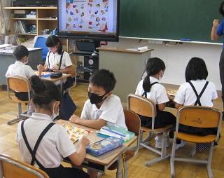 3年生はALTの先生が英語で言った単語をどちらが早く見つけるかというゲームをしていました。そのあと「好きな色は何ですか?」や「好きなスポーツは何ですか?」と質問したり、それに答えたりする学習をしていました。