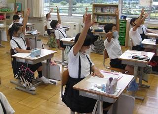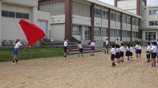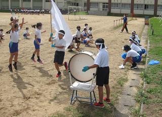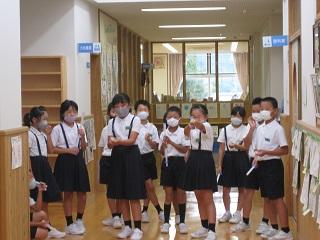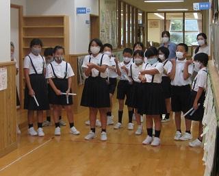 応援の練習に向かう子どもたち。1・2年生が6年生のあとについて移動していました。ほのぼのとした光景でした。今年はコロナ感染症の関係で応援の仕方を工夫しています。6年生が大きな音はペットボトルを使って出そうと考えました。