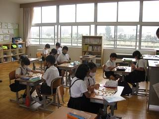 6年生の体育と図工の授業です。図工では自分のお気に入りの場所を描いています。教室やプール、体育館、玄関など思い出のある場所を選んでいました。