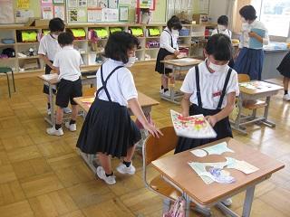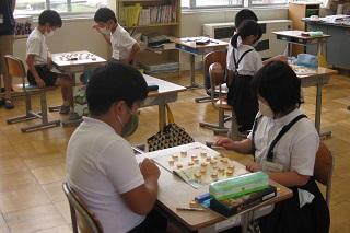 2年生の図工の時間です。一人一人が作成したパズルをお互いにやってみています。一つ一つのパーツが動物や野菜、乗り物になっているなどテーマがあります。
