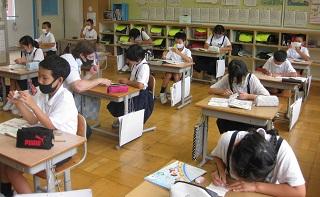 4年生は、「午後9時に寝る」や「午後5時に宿題をする」など「何時に~をする」という言い方を練習していました。