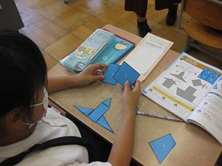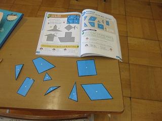2年生の算数の授業です。形の学習をしていました。カードを組み合わせてロケットなどの形を作ったり、カードの仲間分けをしたりしました。違いを見つけて、三角形と四角形に分けることができていました。
