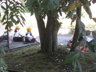 4年生の図工の授業では、「絵の会」にむけて外で絵を描いていました。
