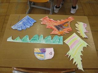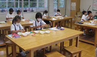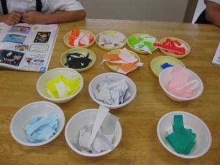 1年生は初めて図工室を使いました。小さくちぎった折り紙を画用紙に貼って絵を完成させていきます。