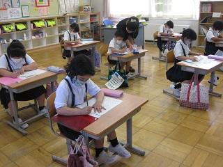 学活の時間です。いよいよ1年生も自学ノートでの学習が始まります。今日は、ノートの使い方やどんなことをしたらよいかなどを説明をしました。ご家庭でも応援をお願いします。
