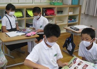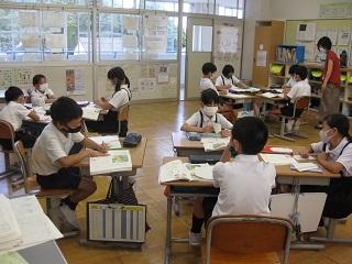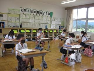 3年生の国語の授業です。「わたしと小鳥とすずと」と「夕日がせなかをおしてくる」の詩のそれぞれの1・2連を比べながら読んでいました。そのあと自分の好きな言葉や表現を書いていました。