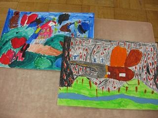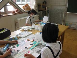 図工の授業では「ふしぎな乗りもの」という題材で、身近なものがどんな乗り物になったら面白いか考えて絵にあらわしていました。動物や昆虫、筆、キャンディーなどイメージ豊かに表現していました。