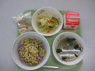 今日の給食は、金時草のそぼろずし、即席漬け、沢煮椀、わらびもち、牛乳でした。金時草のそぼろずしは、ご飯が炊きあがった時は、茶色っぽい色をしていますが、酢が入るときれいな紫色になります。沢煮椀にはたっぷりの千切り野菜と豚肉が入っています。とても美味しかったです。