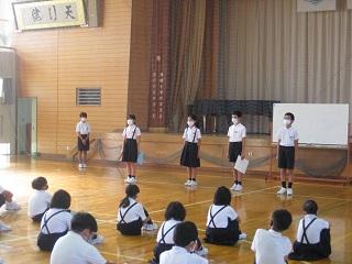 鳥越っ子集会の様子です。各委員会から全校児童に先日の委員会で決まったことやお知らせしたいことを伝えました。今日の集会のめあては、話す方は「相手に伝わる声ではっきり堂々と言うこと」、聞く方は「自分がしなければいけないことを聞き取ること」でした。話す方も聞く方もめあてを意識した素敵な集会でした。しなければいけないことがわかったら、あとは実行することが大切ですね。頑張りましょう。