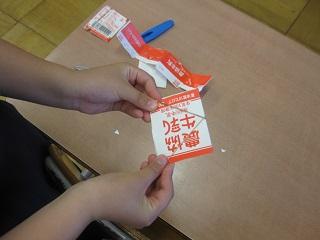 2年生の生活科。ゴムを使ったおもちゃを作りました。ゴムの力で裏返しになるので裏には絵が描かれています。