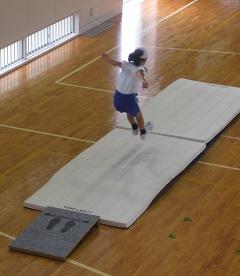 5年生の体育。踏切板を使って遠くまで跳ぶ練習をしていました。