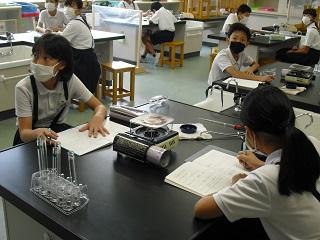 6年生の理科。5種類の水溶液が何かを実験で確かめていました。実験では「安全めがね」もかけて安全に十分気をつけています。