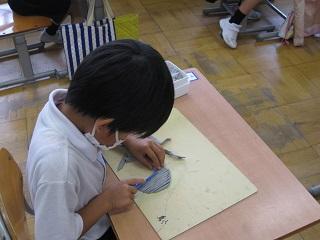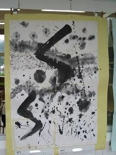 図工では墨に濃淡をつけたり、太さに変化を付けたりして風景などを表現しました。雪が舞っているところを表現した作品です。
