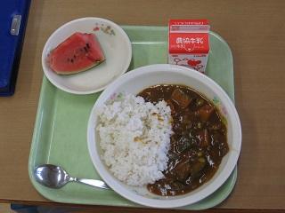 金曜日の給食です。カレーには、かぼちゃ、なすなどの夏野菜がいっぱい入っていて、とてもおいしかったです。