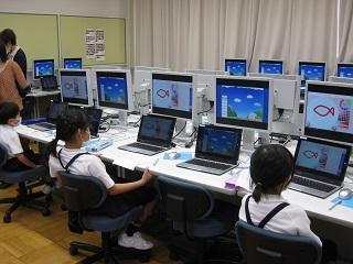 2年生は国語の時間に習った「スイミー」のその後のお話をつくりました。魚の大きさや色、進む方向などを決める方法を習いました。