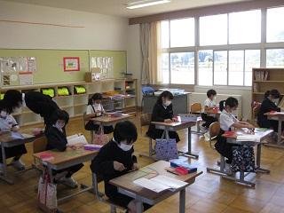 1・2年生の授業の様子です。1年生は国語の時間です。鉛筆の持ち方、書き方を学習していました。「足はぺったん、背中はぴん、おなかと背中にグーひとつ」で姿勢良く、集中して取り組んでいました。また、教室移動のときには、間隔をとって列も乱さず歩いていました。2年生は、算数の授業です。形づくりの学習をしていました。発表も実物投影機を使って上手にしていました。