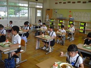 6月1日(月)から学校が再開されました。今日は朝の会の後、各学級で学校での新しい生活様式について話をしました。授業中のこと、休み時間の過ごし方や給食時間のことなどを説明しました。今日から給食も始まりました。給食当番は石けんで手を洗ったあと、ランチルームに入る前や教室(1・2年)で、さらに次亜塩素酸水で消毒します。1年生にとっては、小学校での初めての給食でした。メニューはカレーでした。みんなとてもおいしそうに食べていました。全校での残食もゼロでした。嬉しいことです。
