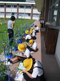 2年生の生活の授業。ミニトマトの観察をしています。