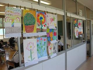 6年生の外国語の授業です。担任とALTのコルビー先生が授業をします。廊下には図工の作品が掲示されています。