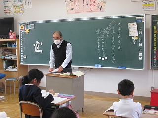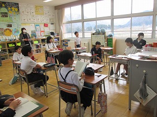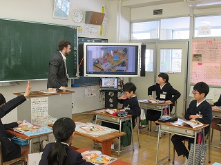 5年生とウッズ先生。英語科の授業におじゃましました。