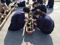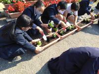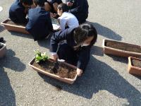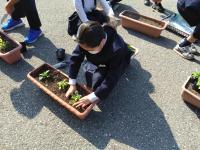緑の少年団の5・6年生に、玄関のプランターにパンジーとチューリップを植えてもらいました。