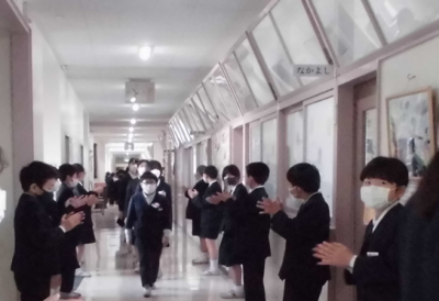 在校生は,卒業式の様子をテレビで見た後,廊下で卒業生をお見送りしました。6年生と楽しく過ごした日々を思い出しながら,お祝いしました。