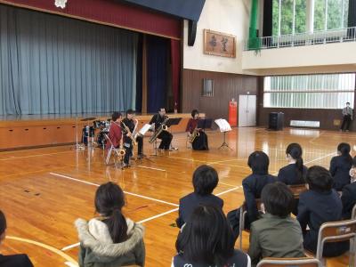 2020年11月5日 18時20分3・4年生は,「きままサクソフォンアンサンブル」の皆さんによるサクソフォンの生演奏を聴きました。事前に児童がリクエストした「猫」や「夜に駆ける」の演奏だけでなく,ディズニーの曲や校歌,音楽の偉人クイズに,最後のアンコールには,鬼滅の刃の「紅蓮華」までとてもたくさんの曲を演奏してくださいました。児童は口ずさんでだり,手拍子をしたりしながら興味津々で演奏を聴いおり,大変有意義な時間となりました。