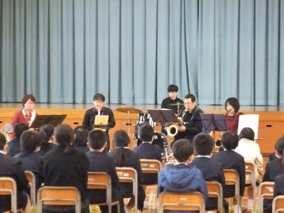 3・4年生は,「きままサクソフォンアンサンブル」の皆さんによるサクソフォンの生演奏を聴きました。事前に児童がリクエストした「猫」や「夜に駆ける」の演奏だけでなく,ディズニーの曲や校歌,音楽の偉人クイズに,最後のアンコールには,鬼滅の刃の「紅蓮華」までとてもたくさんの曲を演奏してくださいました。児童は口ずさんでだり,手拍子をしたりしながら興味津々で演奏を聴いおり,大変有意義な時間となりました。