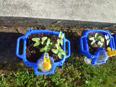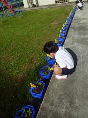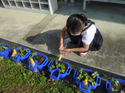 5月の登校日に植えたあさがおの芽がでました。1年生は,ペットボトルのじょうろで毎朝水やりをしています。