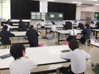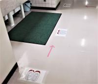 5月の登校日が各学年3回ずつ実施されました。校内には休み時間の過ごし方や三密をさけるための掲示をしたり,児童たちの机を約1m離すように配置を変えたりしています。また,玄関や廊下には消毒コーナーを設置しています。