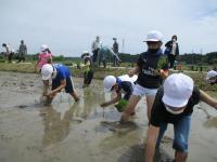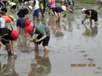 5年生が総合の学習で田植え体験をしました。初めは,泥の感触が嫌で,田んぼに入るのをためらっている子も多かったですが,すぐに慣れてきて,最後はもっとしたいと言いだすくらい楽しく一生懸命やっていました。
