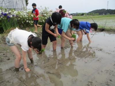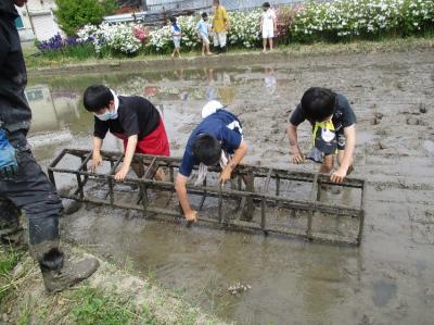 JA能登わかばのみなさん,能登やまびこさんのみなさんのご協力のもと,田植え体験を行いました。社会科の学習で米作りについて学んだ子どもたちは,実際にころがしをしたり,稲を一つ一つ手で植えたりしました。田植えの大変さや米作りに携わる方々の思いに気付く機会となりました。稲の生長が楽しみです。