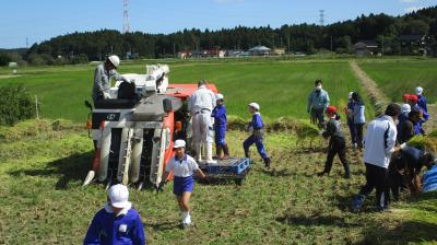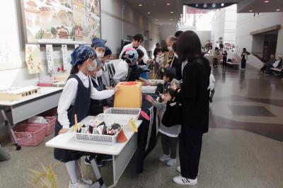 収穫したお米を中條の和菓子屋さんに依頼し,お饅頭にしたものを地域の方に販売しました。あっという間に400個完売し,子ども達は大喜びでした。最初,お客さんへの声かけに苦戦していましたが,いつの間にか慣れて元気な声が飛び交っていました。普段あまり経験できない大変貴重な時間となりました。