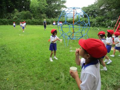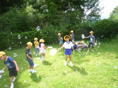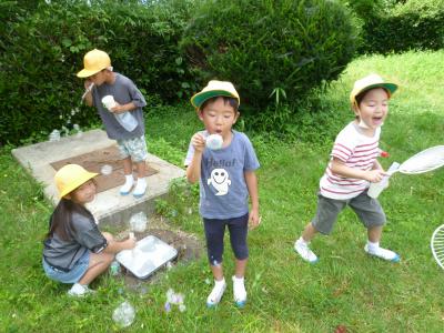 マヨネーズの容器やペットボトルを使った水遊びと,ストローやうちわを使ってシャボン玉遊びをしました。