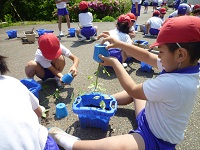 先日,生活科でミニトマトの苗を植えました。硬くなった土をほぐすところから始まり,肥料を混ぜたり,プランターに土を入れたりと,苗を植える準備を自分たちでしました。
