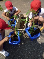 一人にひとつの大切な苗です。毎日水をしっかりあげ,雑草とりもしましょうと話しました。しっかりとお世話した分だけ,大きくて美味しいトマトが取れます。これから,どんな風に育っていくのか,とても楽しみですね。