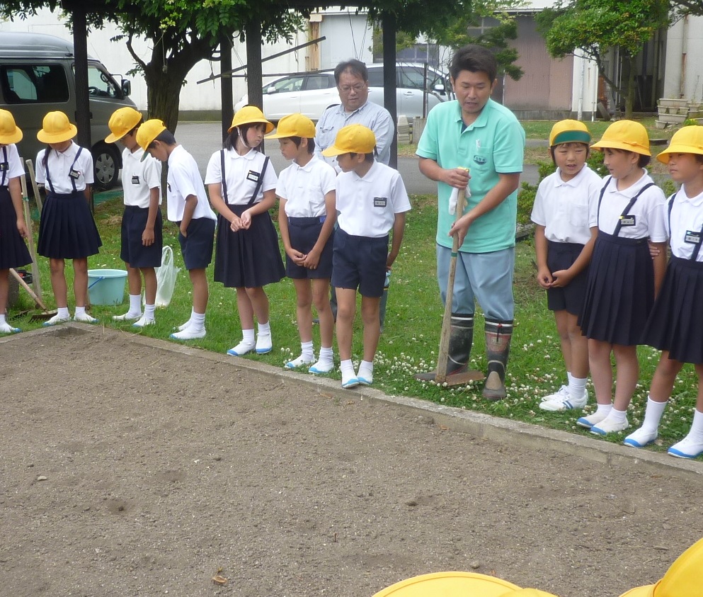 今日,JAの亀井さんと百海さんをお招きして,大豆の種まきをしました。