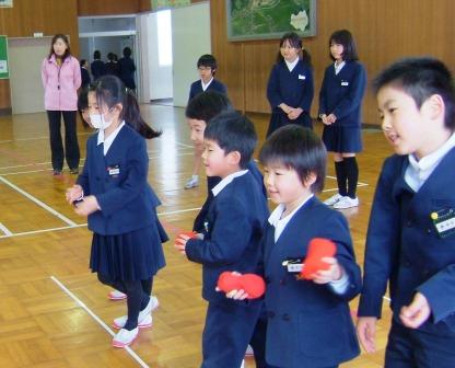 その後,ぬり絵,折り紙,紙芝居,絵本,物作り(ぴょんぴょんガエル・びっくり箱),マット運動の発表,ゲームなど11のコーナーを開いて交流しました。児童たちは,一生懸命読み聞かせをしたり,教えたりしていました。どの児童も教室では見られない,おにいさん,おねえさんの表情をしていました。会場全体がとっても温かい雰囲気に包まれ,心地良い歓声であふれていました。
