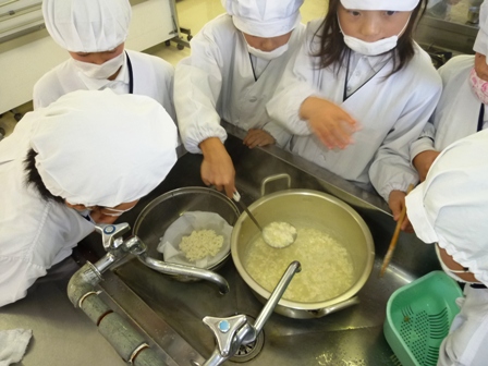 2月1日(金)総合の時間を使って「豆腐作り」をしました。講師の先生は,保健センターの高柳先生にお願いしました。 布をつかって豆乳をしぼる作業では,こつがなかなかつかめず苦戦する姿が見られました。また,子どもたちは簡単に豆腐が固まるものと思っていましたが,なかなかうまくいきませんでした。少しずつ完成させるグループが出てきましたが,豆腐に固まらず,「もうダメや!」と,あきらめの声を出すグループもありました。慎重に豆乳の温度を測りながら70度に保ち,優しくにがりを混ぜていくとやがて表面に透明な液が浮いてきて,豆腐がようやくできてきました。「やったー」とうれしそうな歓声が響きました。豆腐が固まる様子は本当に感動的でした。