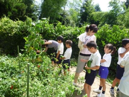 久しぶりに畑へいくと、ミニトマトやきゅうりがいっぱい実っていました。子ども達は大喜び。次々と大きなきゅうりを引っ張って、収穫。赤く熟したミニトマトも初めは手に取るのも嫌がっていた子も、一つ食べてみてあまりのおいしさに,袋の中へいっぱい入れようとします。