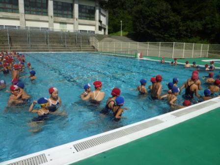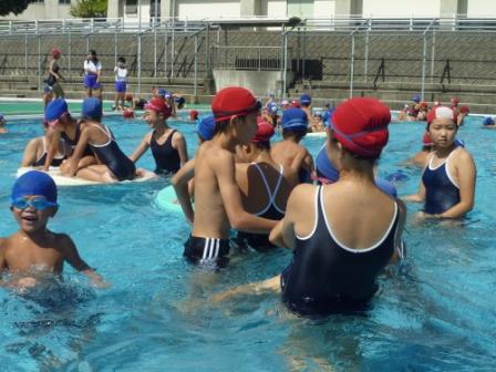 手をとりながら 同じ班の1年生と6年生がプールで楽しく遊びました。