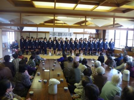 今日は6年生が一人暮らしのお年寄りの方との交流会に参加しました。『ほたる』・『ふるさと』・『明日があるさ』を歌とリコーダーで演奏しました。お年寄りの方も一緒に口ずさみながら楽しい時間を過ごしました。