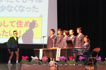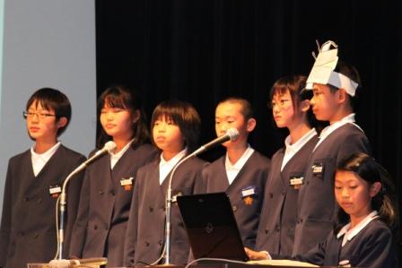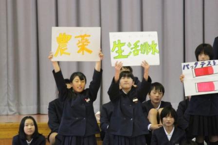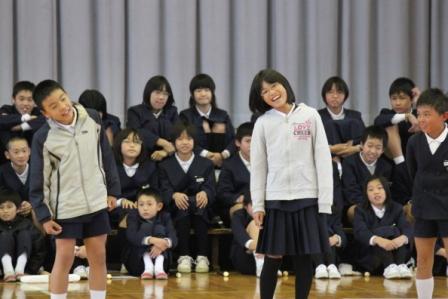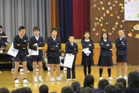 全校による発表集会がありました。6年生は環境学習で学んだことをもとに『ほっほっほたるこい!ふるさとの環境を考える』を発表しました。環境を壊してきたのは人間。だからその環境を少しでもよくしていくのが僕たちの役目。自分たちに今できることをしていこう!と劇を交えて訴えました。