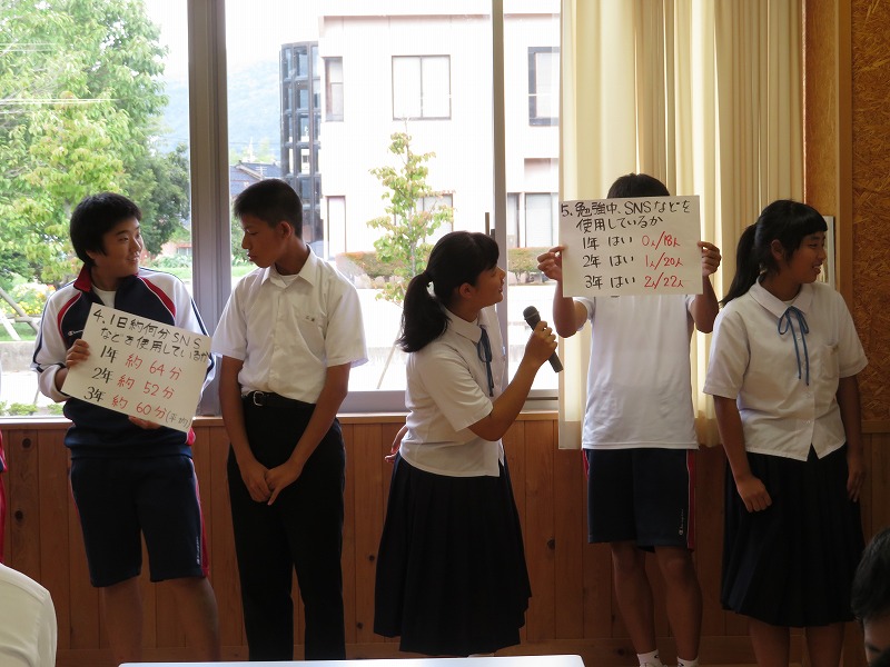 給食後の時間に生活学習委員会がSNSについてのアンケート結果を発表しました。