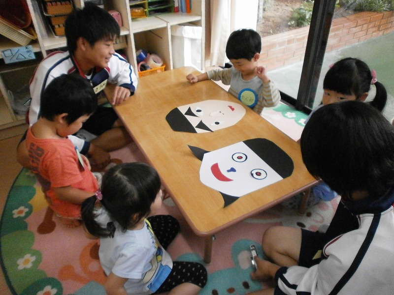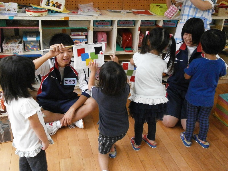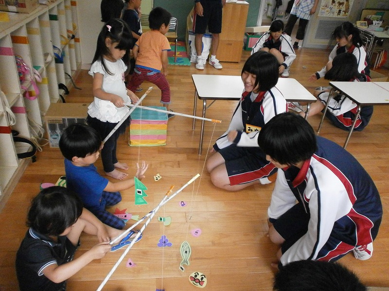 授業で作った手作りのおもちゃで園児と一緒に遊びました。
