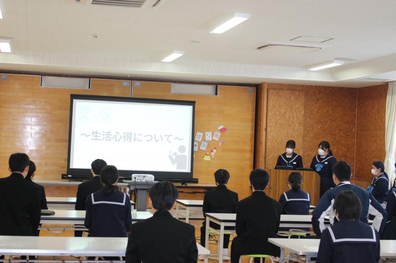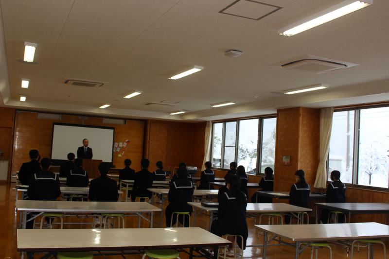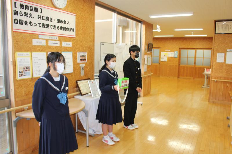 終業式に先立ち、「未来に残そう青い海 海上保安庁図画コンクール」2年生:細谷結珠さん、「税についての作文コンテスト」2年生:上野蒼唯さん
