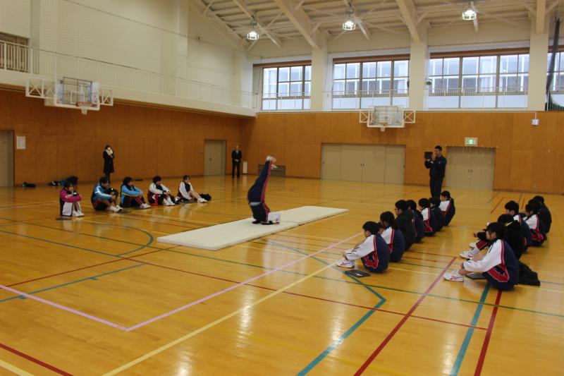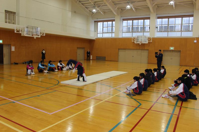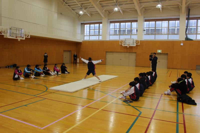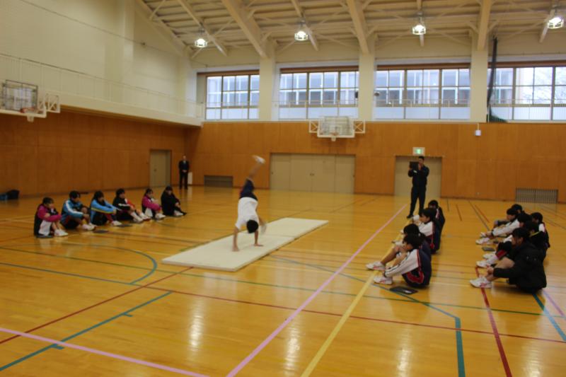 今日は、習得した技を組み合わせて全校で発表会を行いました。技の出来映えだけでなく、技の組み合わせ方やつなぎ方を工夫するなど、滑らかさを追求した演技を披露することができました。