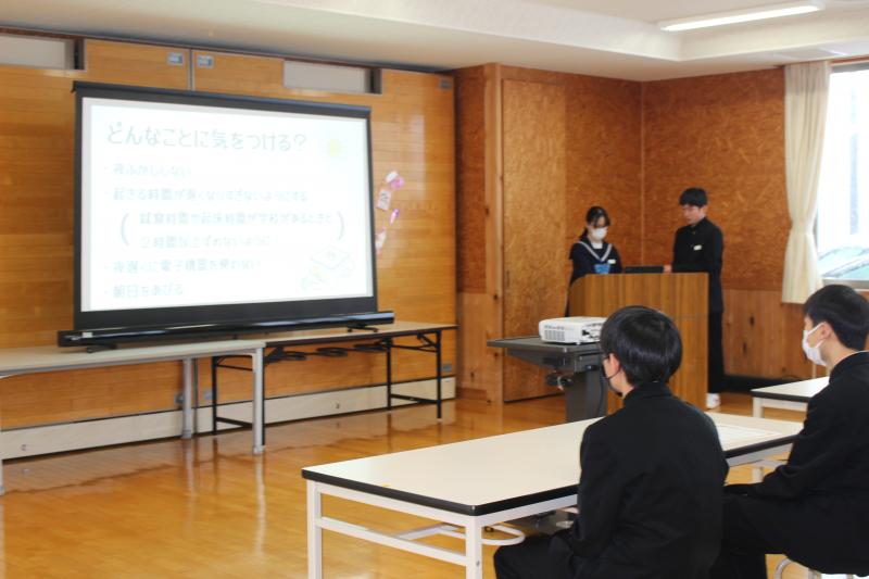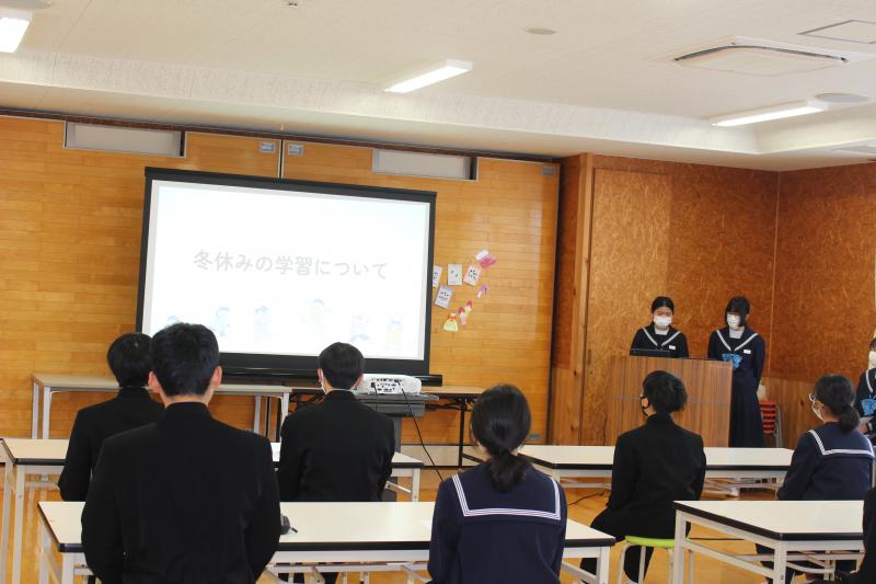 終業式と各委員会からの冬休みのすごし方の提案では、「命を大切にする」「生きる力を養う」「粘り強くチャレンジする」の視点が示されました。